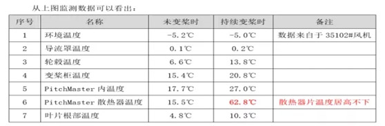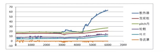 為了研究 LUST變槳過溫,合信銳風新能源設計研發并生產了溫度采樣設備,對風場過溫機組進行系統的溫度數據分析。經過我司對該風機溫度數據監測,系統各關鍵點數據如下: