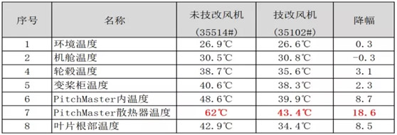 綜上所述,變槳系統過溫原因為:風機在正常變槳工作時PitchMaster 產生的熱量無法及時從散熱器片散出,導致 PitchMaster內部過熱,從而引起變槳柜、充電器、超級電容等器件溫度過高。同時輪轂內部空氣相對密閉,熱空氣在輪轂里堆積無法消散,夏季高溫時,這種現象尤為嚴重。