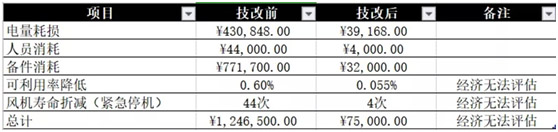 以某風場33臺風機全年損壞率為例,IGBT損壞數量38塊(其中12塊炸機),AINT板損壞16塊,風扇電源板損壞15塊,風扇控制板損壞12塊。每種故障停機時間按照1天計算,技改收益數據對比如下: