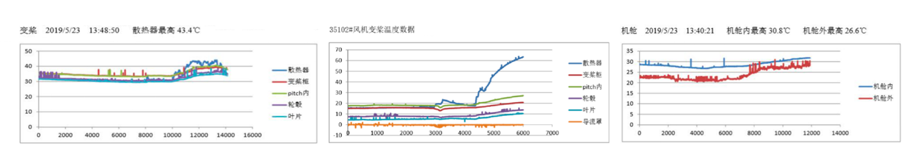 客戶實際服務案例中,挑選了一臺變槳過溫典型機組 35102#風機。經過對該臺風機的變槳數據長期監測,在合信銳風變槳系統服務工作過程中,系統各關鍵節點溫度數據參考如下: